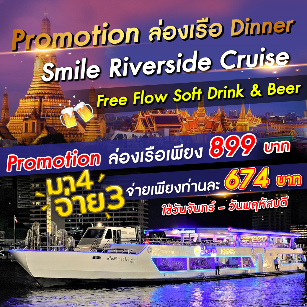 18.00-18.30 น. | เช็คอินที่เคาน์เตอร์เรือริเวอร์ไซด์สไมล์ครูซ ที่ชั้น G โซนสุขสยาม ข้างร้านนารายา ไอคอนสยาม |