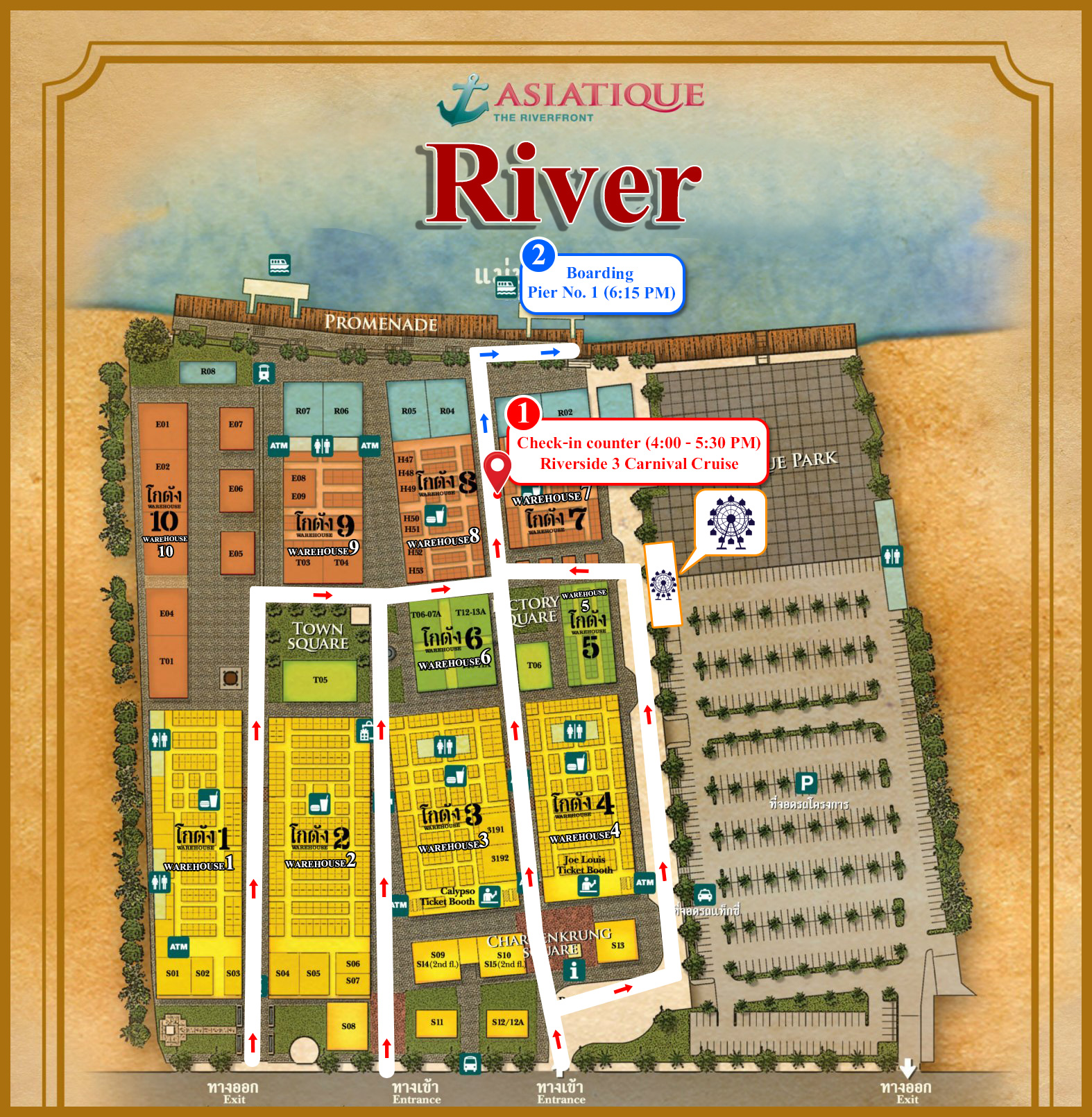 • จุดเช็คอินณ ท่าเรือเอเชียทีค ASIATIQUE The Riverfront (จุดเช็คอิน ทางเดินระหว่าง โกดัง 7 และ โกดัง 8)